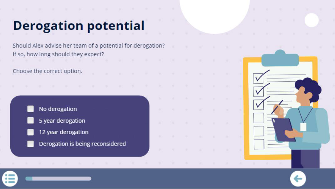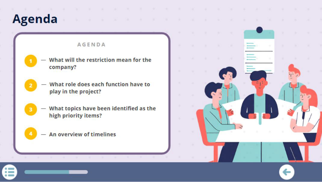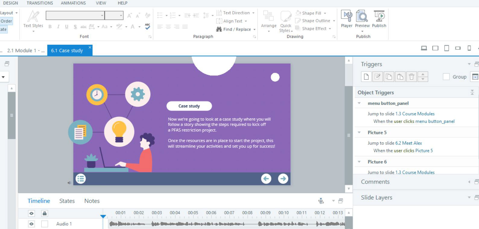 Four modules and a case study were built inside one course and the user proceeds module by module via a menu. The menu items remain locked until the learner proceeds to the next one.